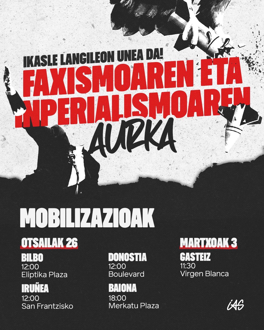 Faxismoaren eta inperialismoaren aurka mobilizatuko da, "olatu berri hau bultzatuz". Martxoaren 3rako, gainera, ikasle-greba antolatu du Gasteizko sarraskiaren 50. urteurrena dela-eta.