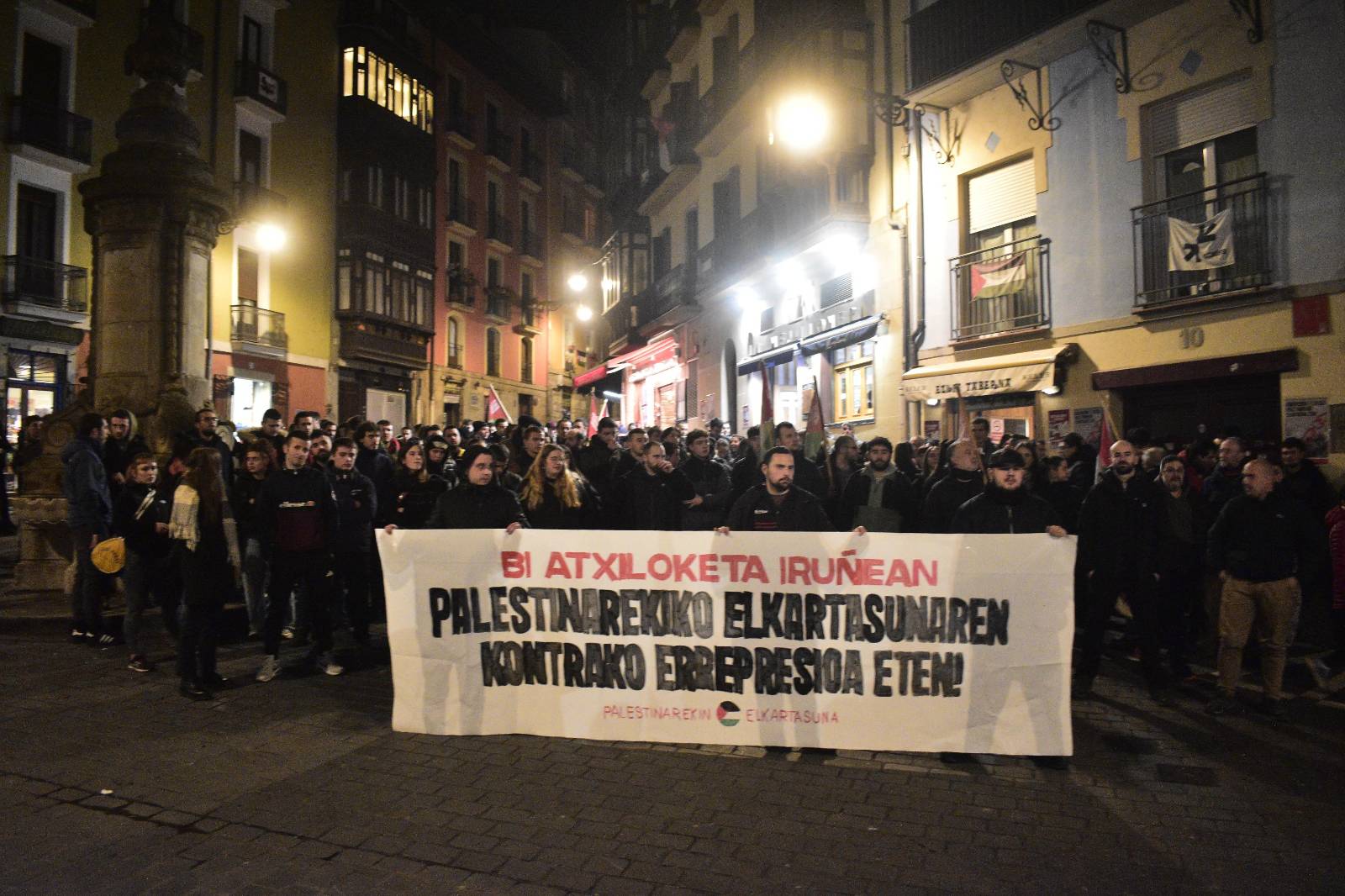Palestinarekiko elkartasunaren kontrako errepresioa eten. Hala zioen atzo iluntzean Palestinarekin Elkartasuna plataformak Iruñeko (Nafarroa) Nabarrerian zabaldutako pankartak, protesta bat egin baitzuen goizean izandako atxiloketak gaitzesteko. Gutxienez bi pertsona atxilotu zituen Espainiako Poliziak, urriaren 15eko gertakari batzuei lotuta: egun horretan, Palestinaren aldeko mobilizazioak eta geldialdiak izan ziren Euskal Herri osoan.