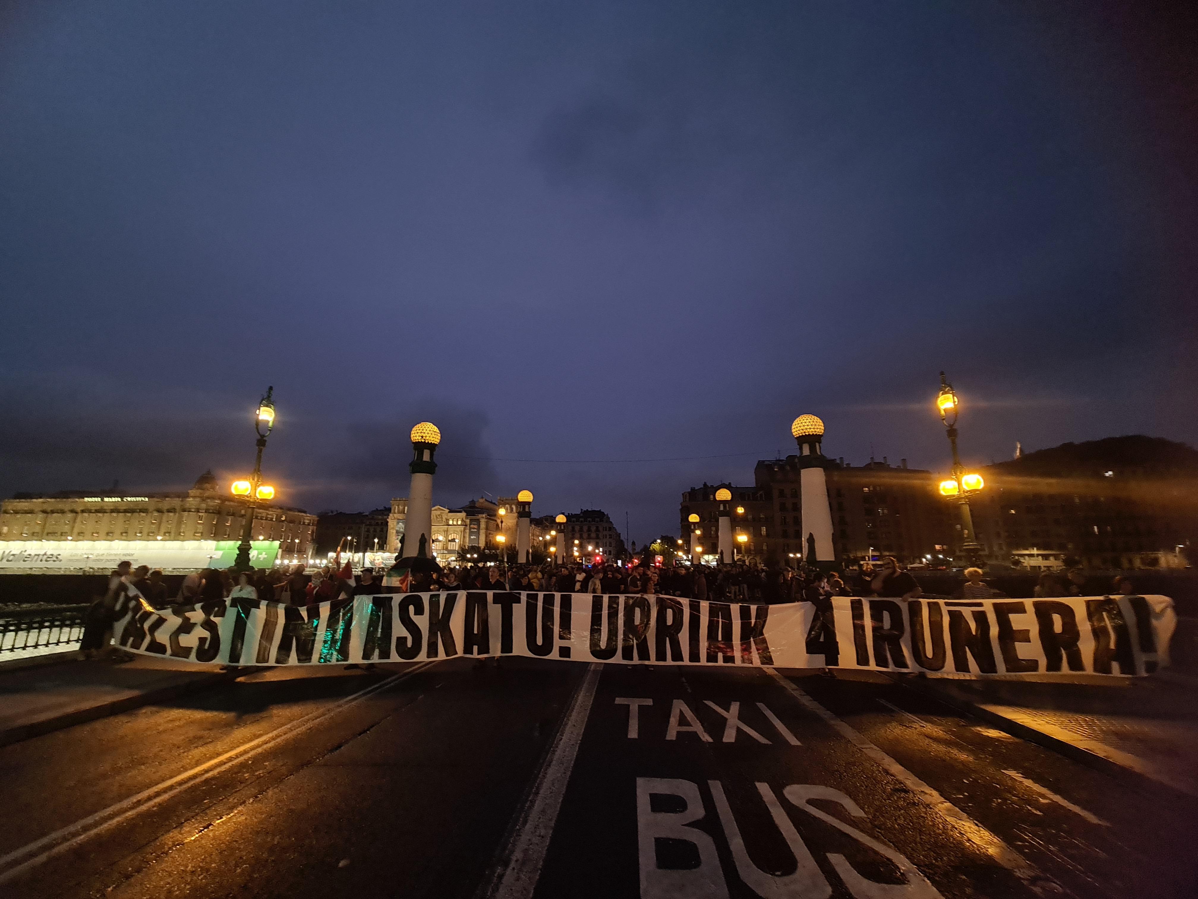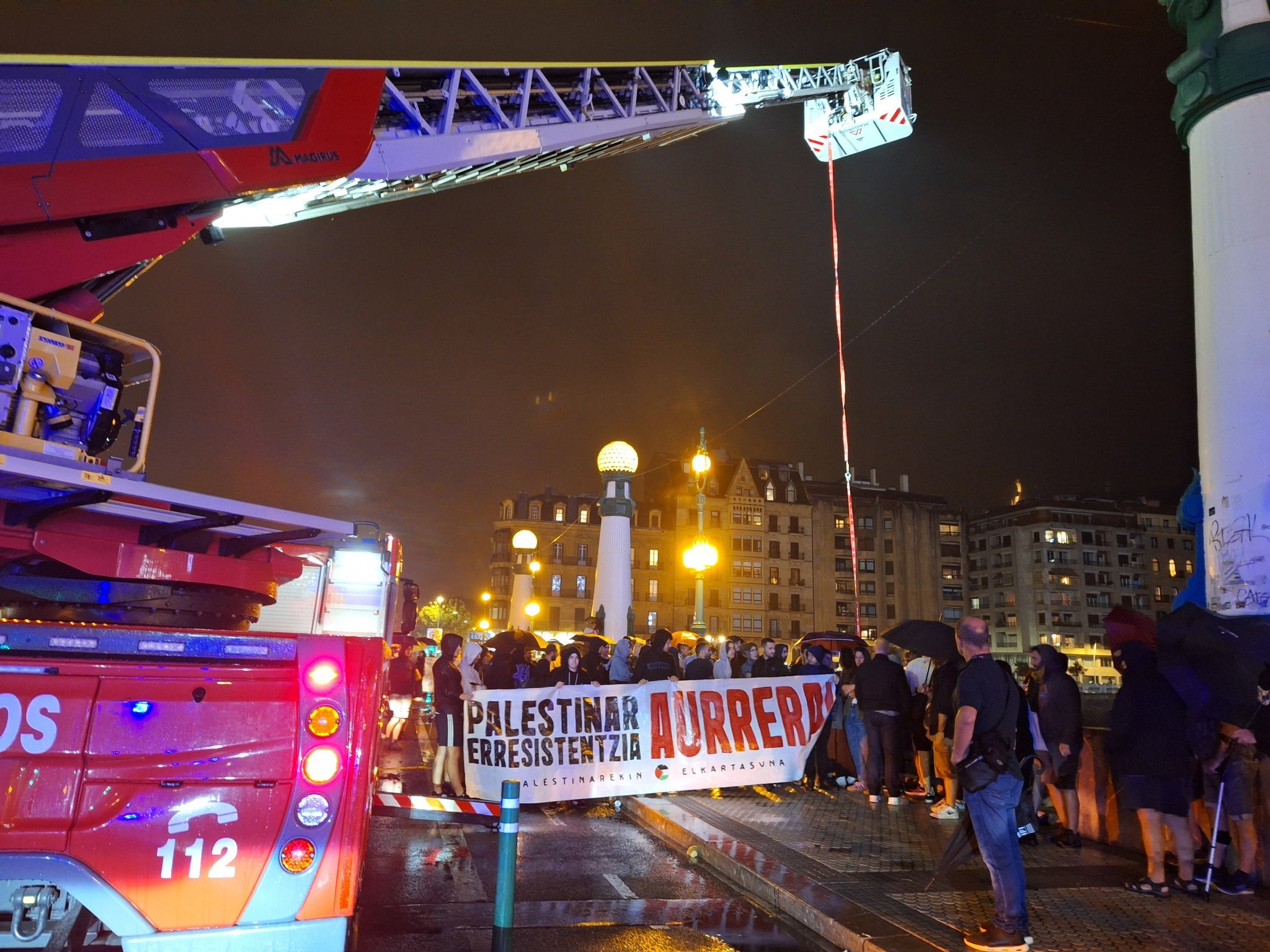 Bitartean, ertzain ugari bildu ziren Kursaal inguruan, istiluen aurkako materiala zutela. Zubiko ekintza bukatzean, baina, Alde Zaharrerantz mugitu ziren manifestariak, eta bertan zabaldu zituzten berriz Palestinaren askatasunaren aldeko oihuak.