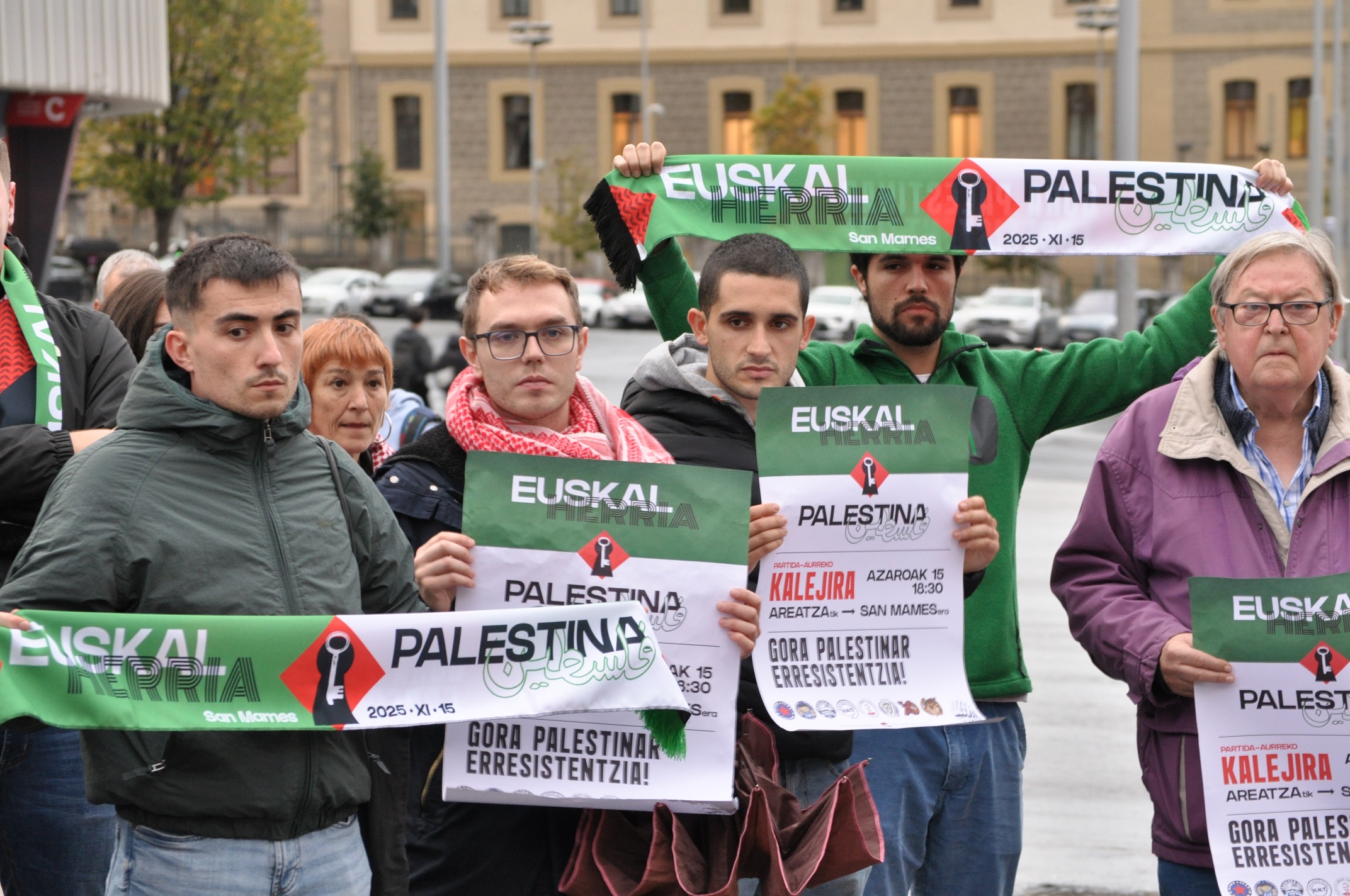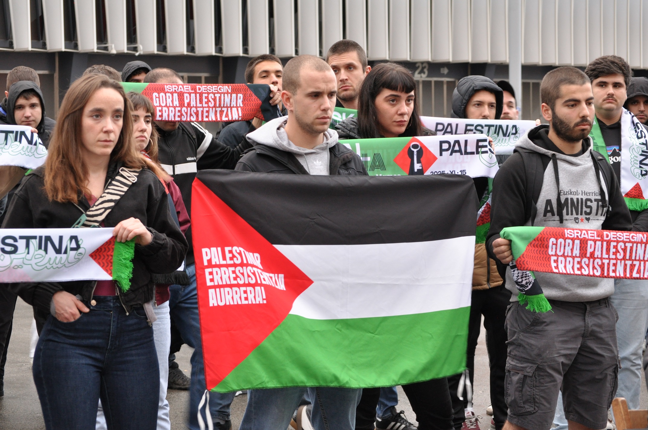 Gaur arratsaldean Bilbon (Bizkaia) egin dute agerraldia Palestinarekin Elkartasuna plataformak eta Euskal Herriko zaletuen hainbat harmailak. Azaroaren 15ean Euskal Selekzioaren eta Palestinakoaren lagunarteko partida jokatuko den lekutik gertu izan da prentsaurrekoa; San Mamesetik gertu, alegia. Izan ere, hurrengo astean izango da bi selekzioen hitzordua Bizkaiko hiriburuan, eta hori baliatu nahi dute Palestinarekin Elkartasunak eta euskal zaletuek, kaleak aldarriz betetzeko beste behin ere.