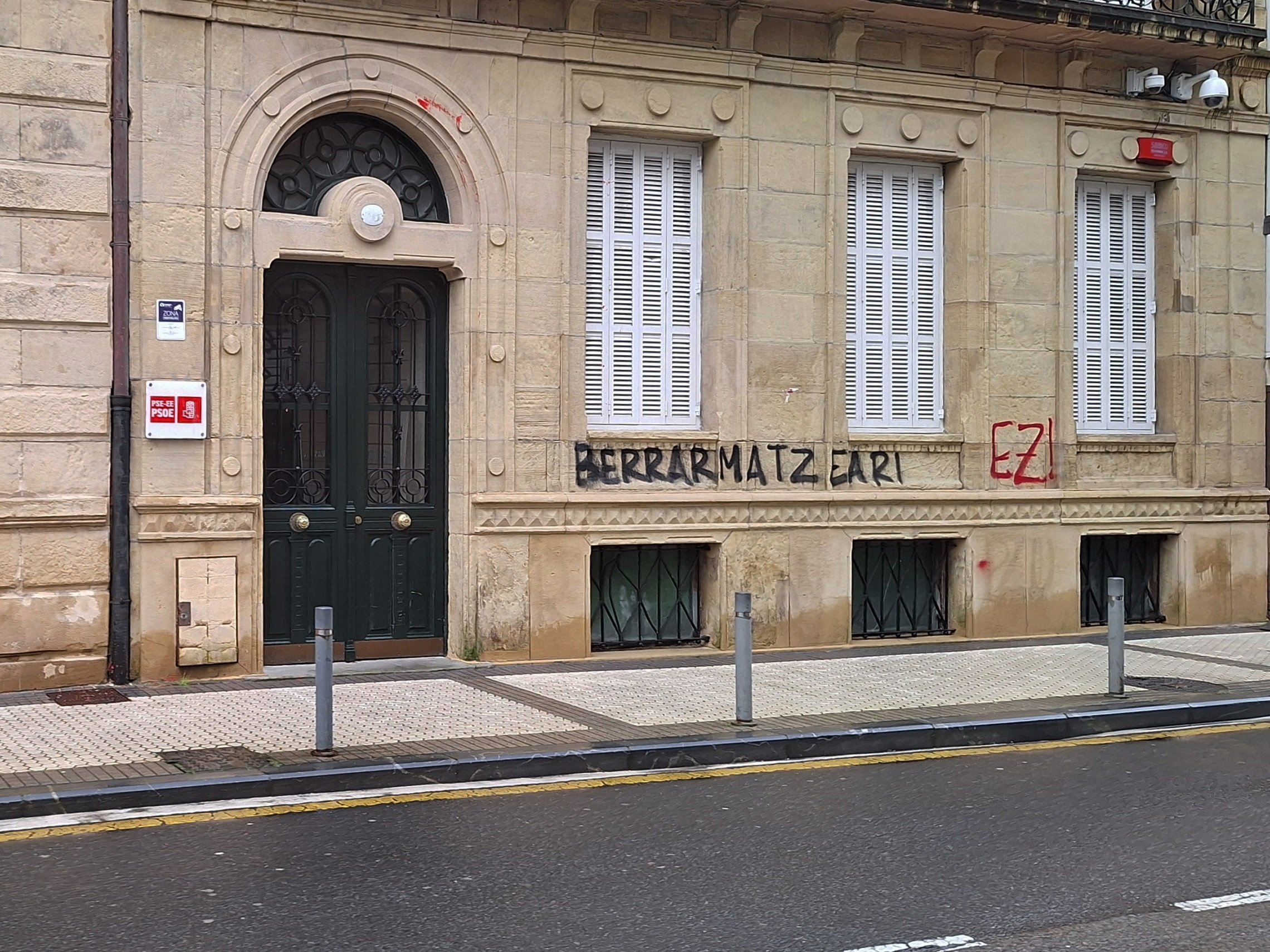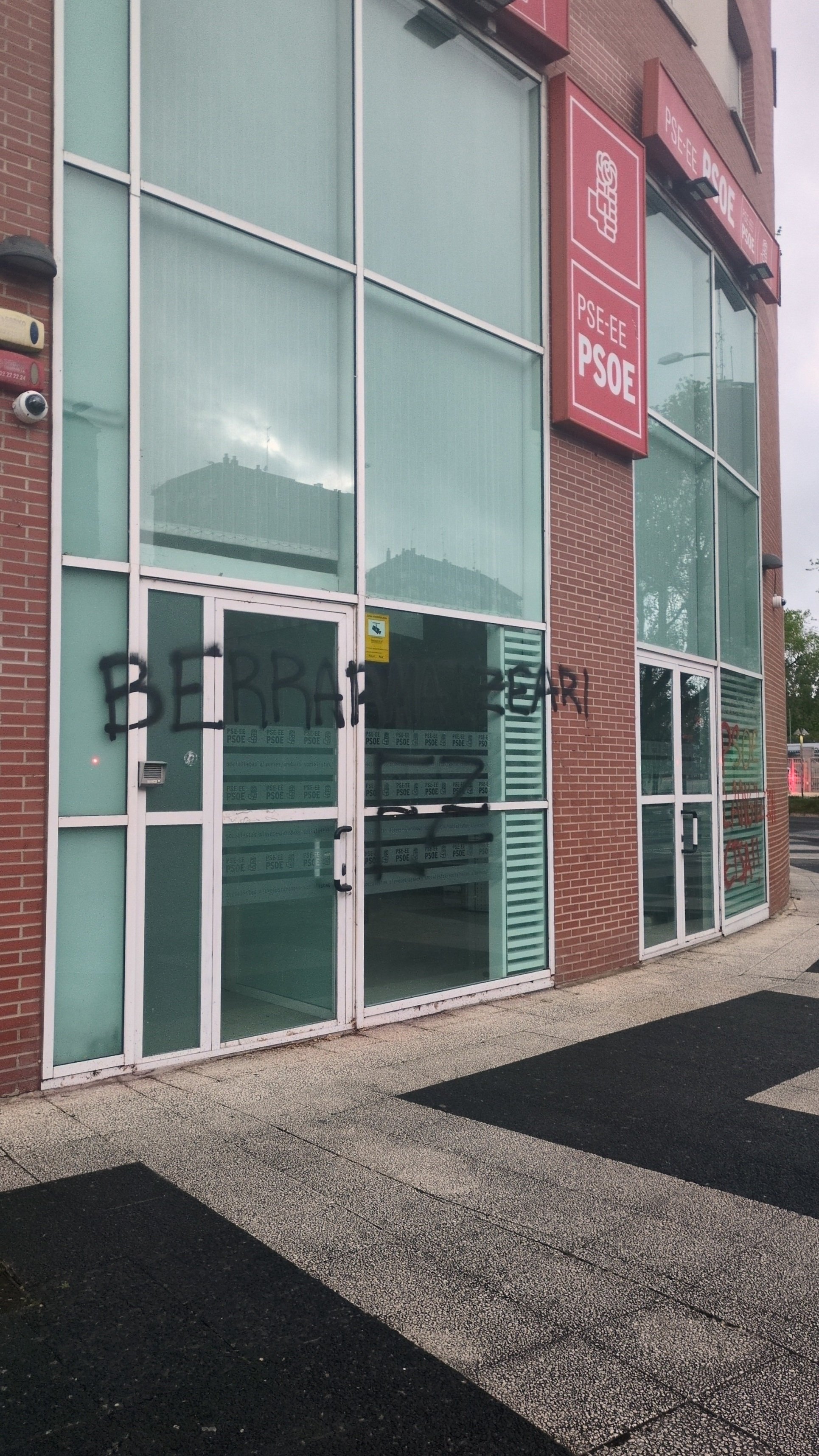 Esaterako, Espainiako Estatuan inbertsio militarra etenik gabe areagotzen ari den alderdi politiko nagusia jarri dute jopuntuan; gobernuburu den PSOE, alegia. PSE-EEk Gasteizen (Araba) zein Donostian (Gipuzkoa) dituen egoitzak markatu dituzte horren harira, eta ondoko margoketak irakurri ahal izan dira bertan azken orduetan: "Berrarmatzeari ez!", "PSOE langileon etsai" eta abar.