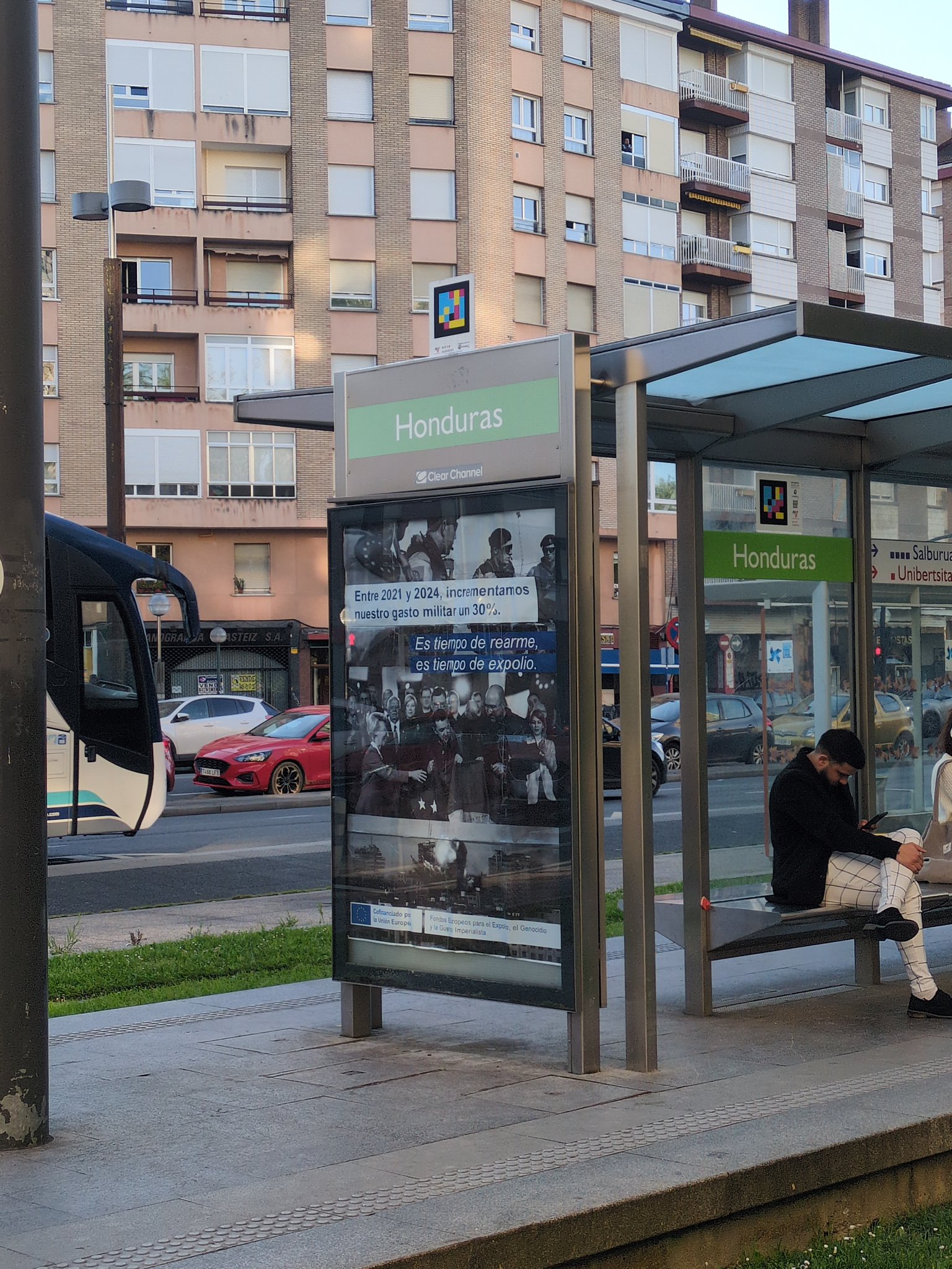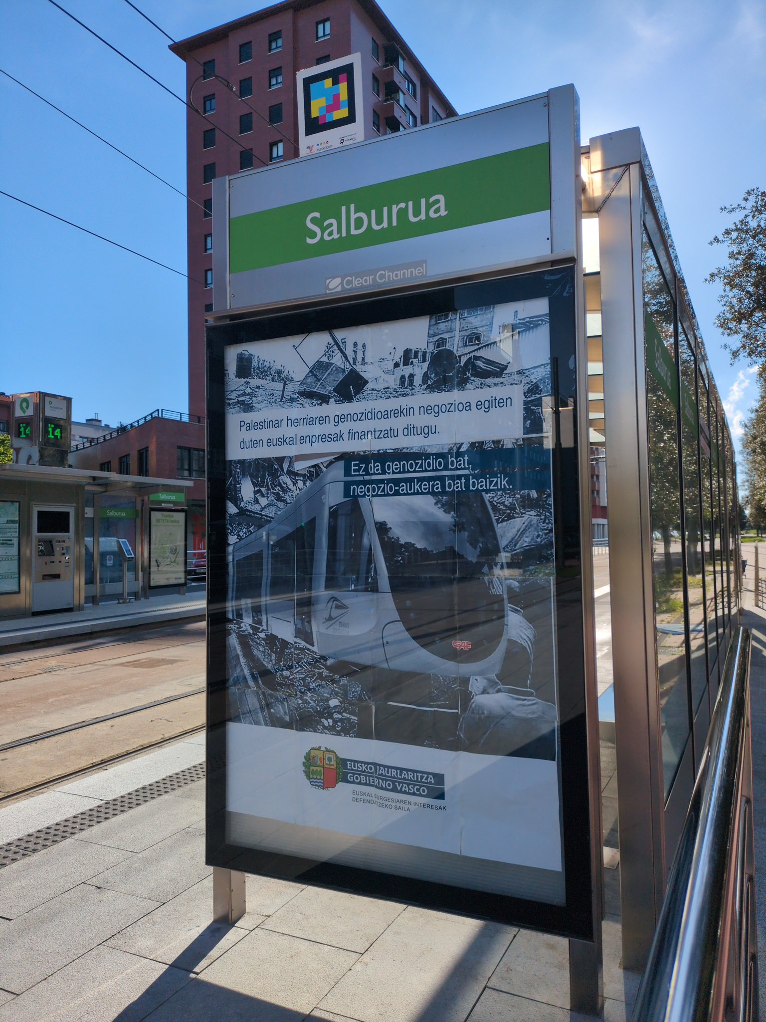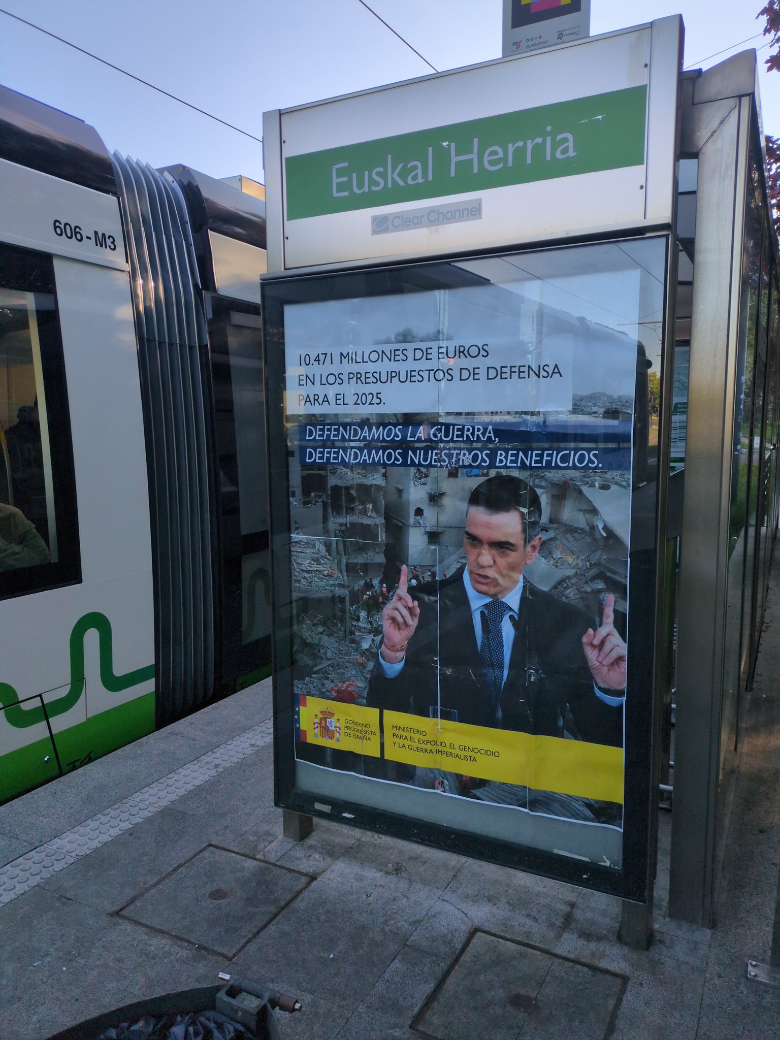 Atzo, esaterako, Gasteizko (Araba) hainbat tranbia-geltokitan ikusi ahal izan zen gerraren eta gerraren erantzule politikoen aurkako salaketa. Publizitatea jarri ohi den paneletan, Espainiako Gobernua edo Eusko Jaurlaritza seinalatzen zituzten kartel handi batzuk agertu ziren, mezu zuzenekin. Pedro Sanchez Espainiako Gobernuko presidentearen irudiarekin, adibidez, "10.471 milioi euro 2025erako defentsa-aurrekontuetan. Defenda dezagun gerra, defenda ditzagun gure irabaziak" mezua ageri zen. Edo, Jaurlaritzaren logoarekin batera, honakoa irakur zitekeen: "Palestinar herriaren genozidioarekin negozioa egiten duten euskal enpresak finantzatu ditugu".
