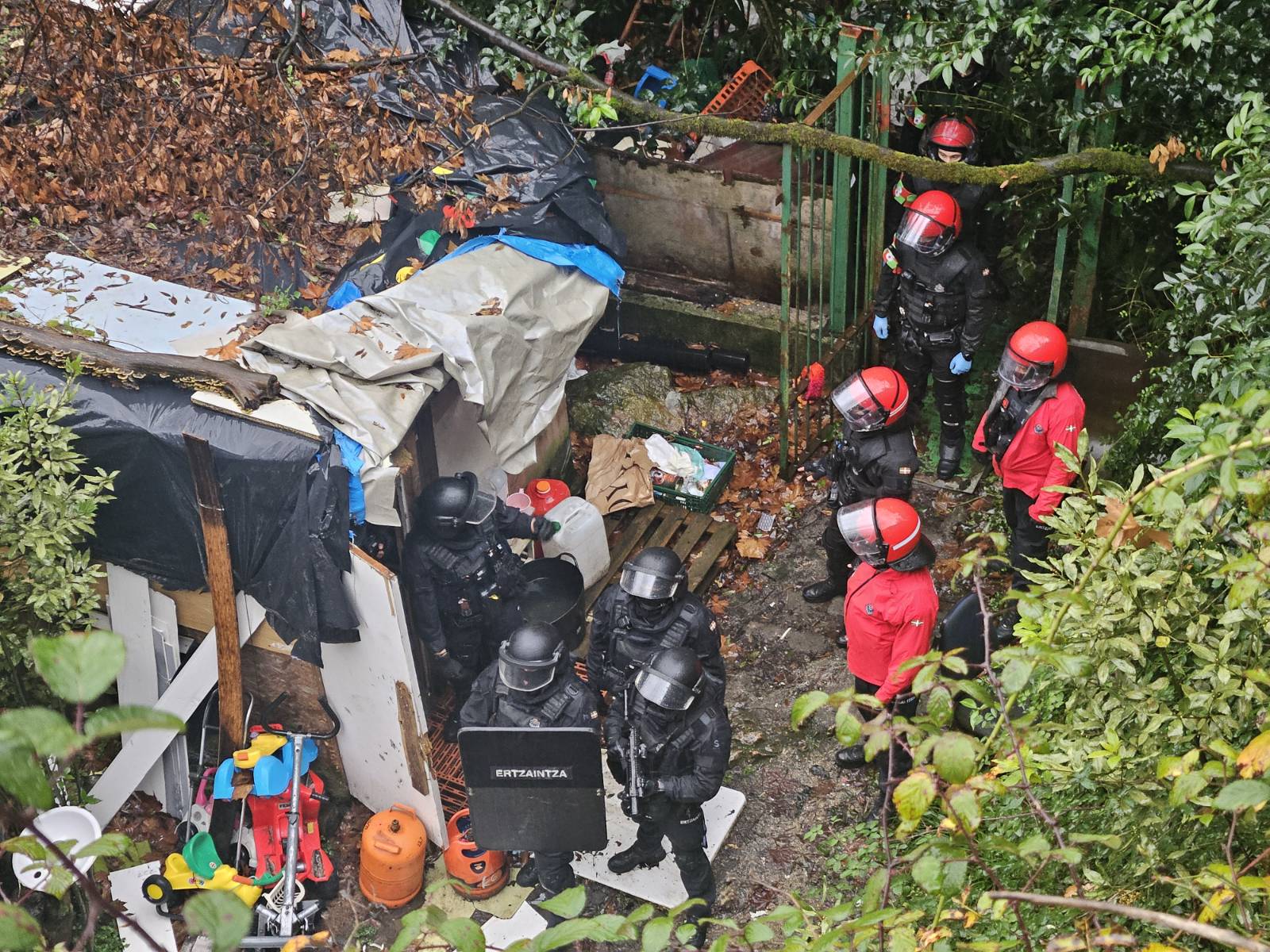 Espainiako Poliziak, Ertzaintzak eta Donostiako Udaltzaingoak elkarlanean gauzatu dute etxegabetze masiboa, dispositibo erraldoi batekin: 40 bat polizia-ibilgailu bertaratu dira denera, drone eta guzti, eta desalojoaren aurka protestan ari ziren pertsonak kanporatu eta urrundu dituzte.