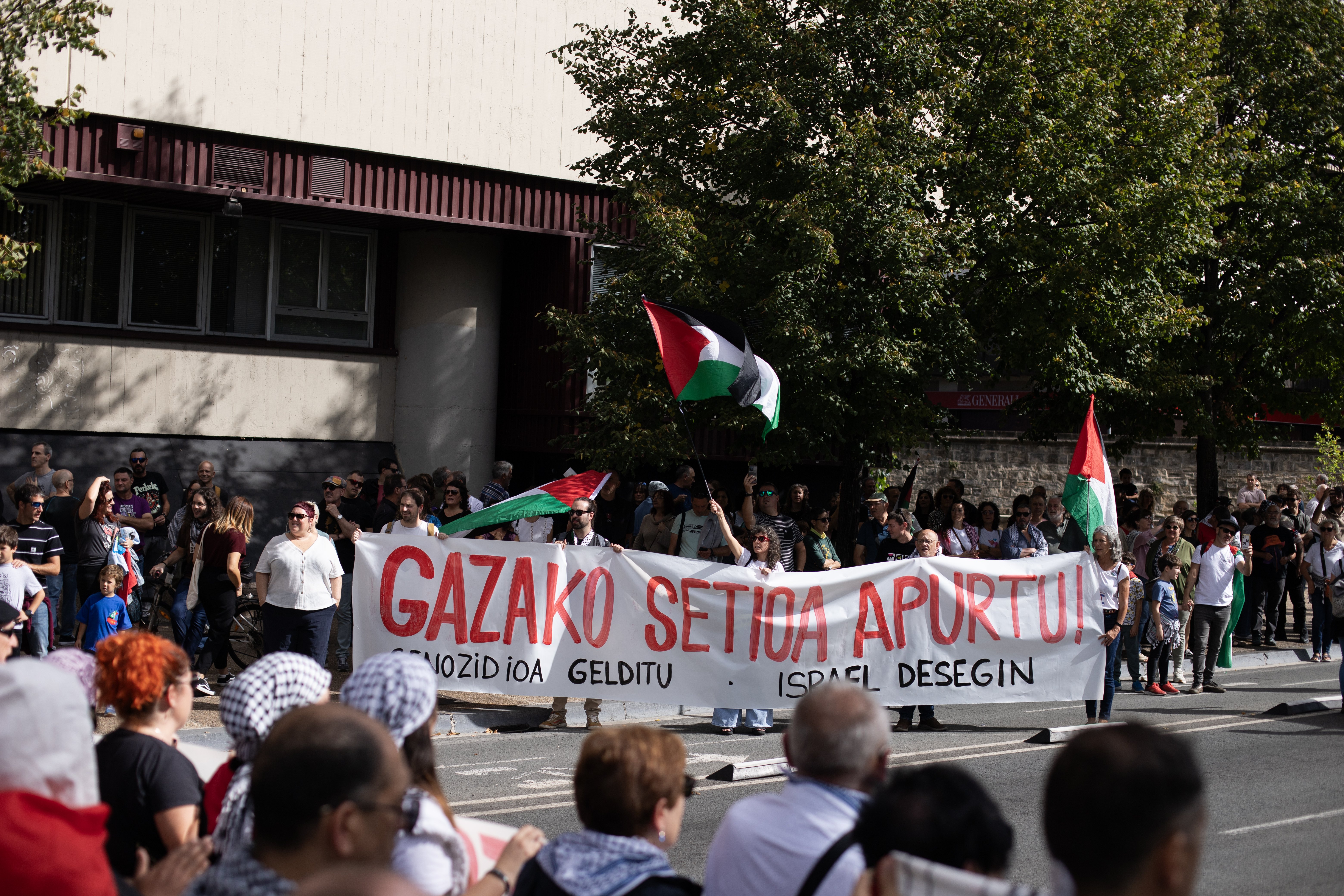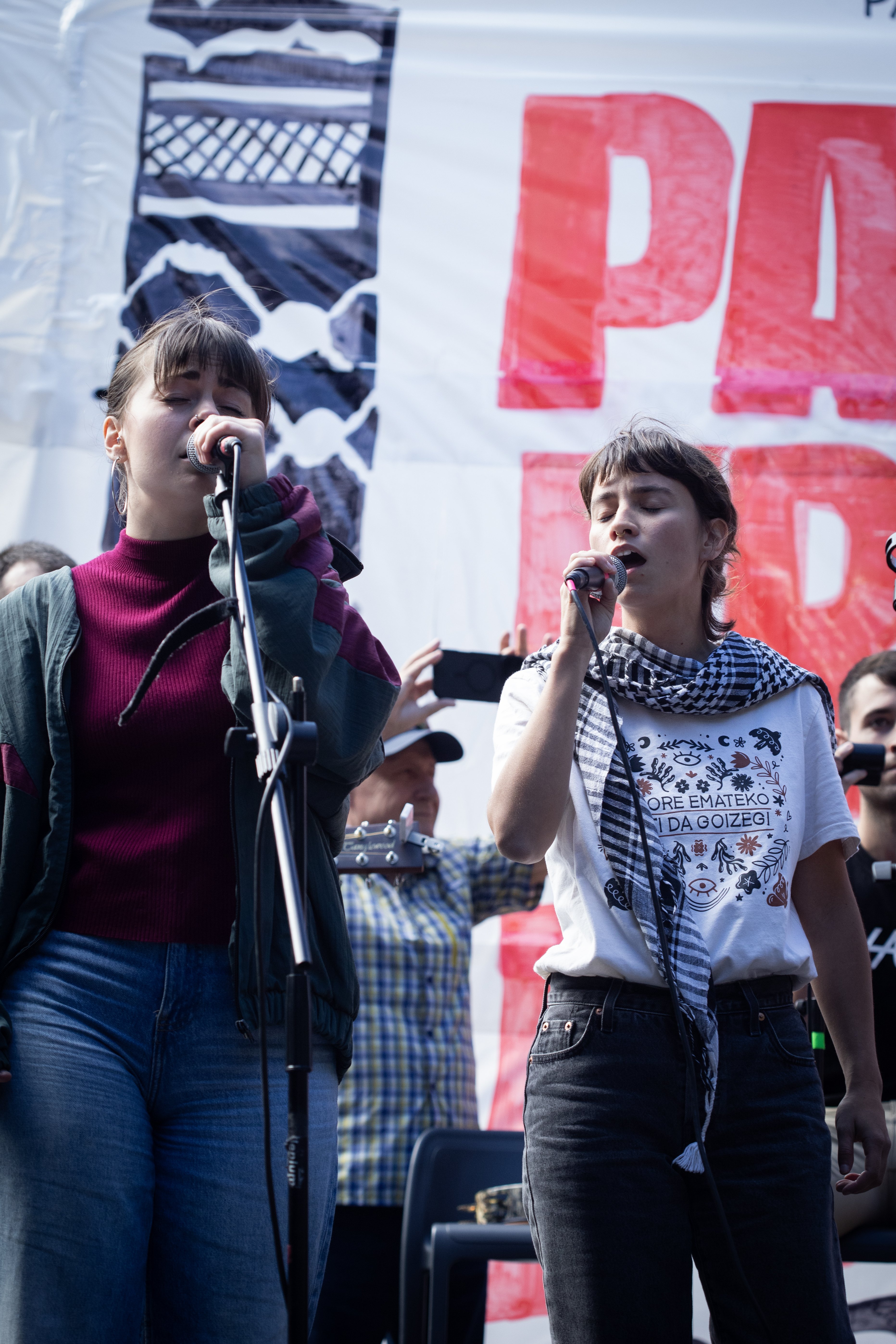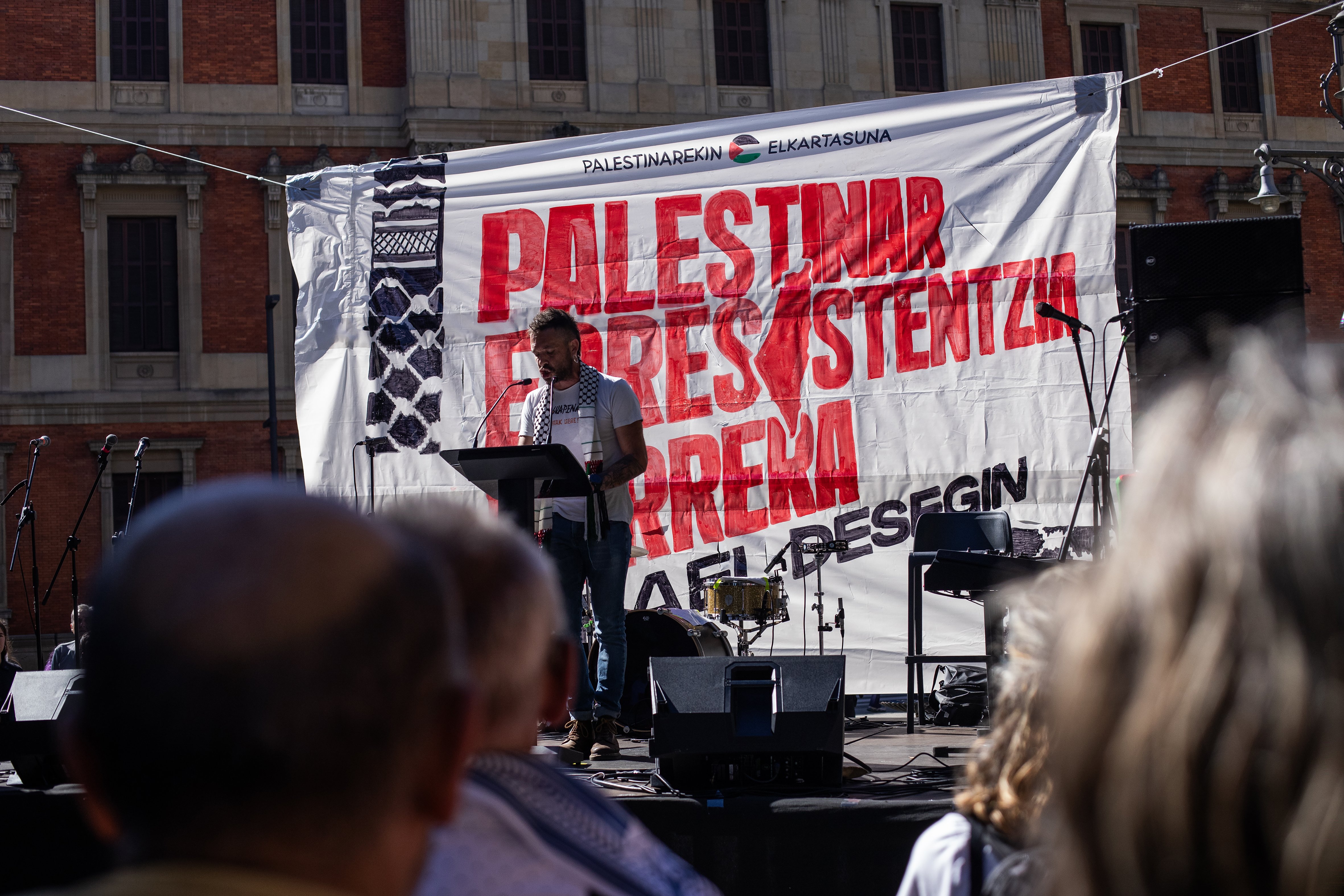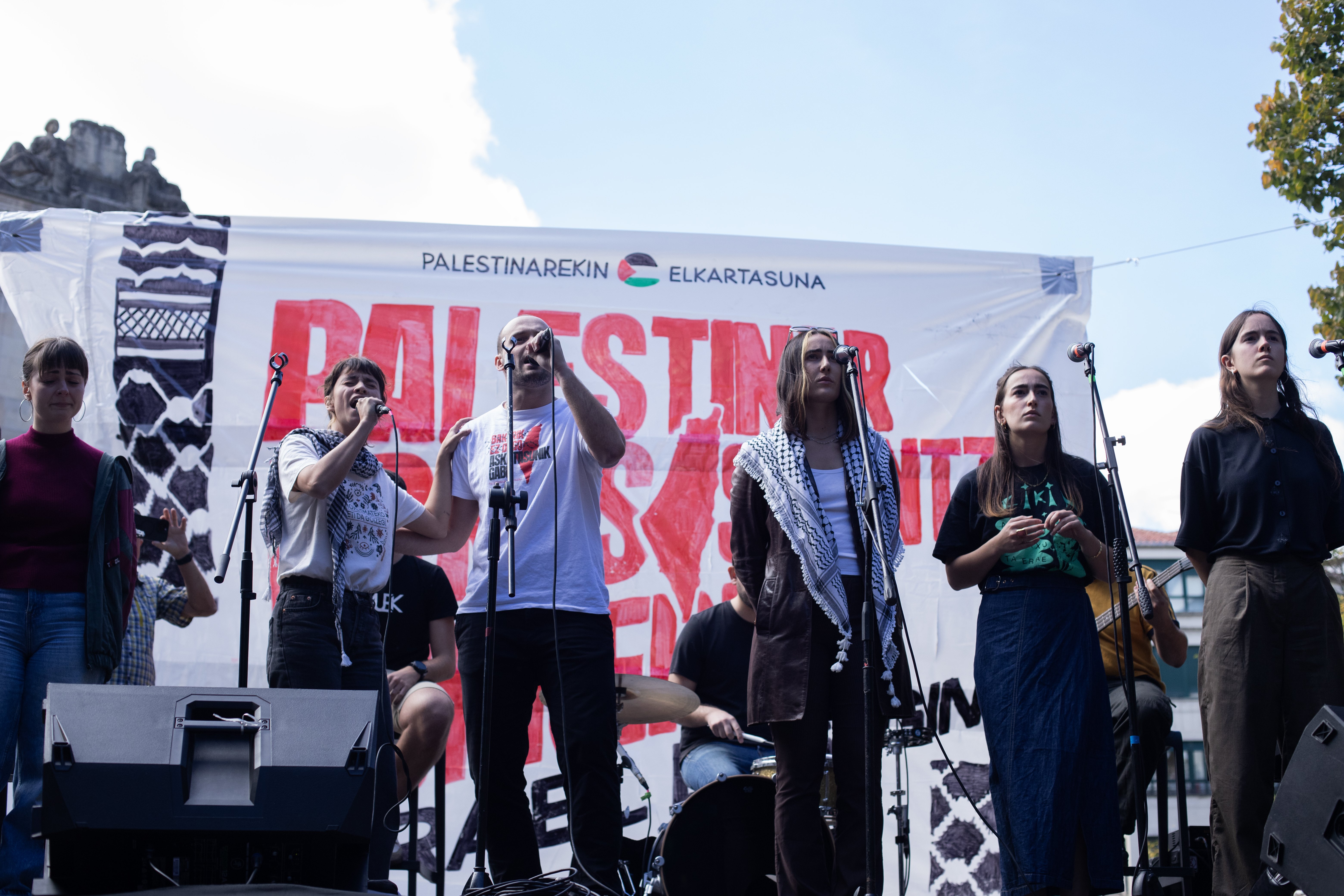 "Gaurkoan oihu egin dugu palestinar erresistentziaren alde, horrek hartzen dituen forma guztietan; oihu egin dugu Palestina osoaren deskolonizazioa eta Israelgo entitate terroristaren desegitea mahaigaineratzeko, eta oihu egin dugu sionismoaren konplize ororen aurka", azaldu dute antolatzaileek. Horrez gain, babes osoa eman diete Global Sumud Flotillako kideei.