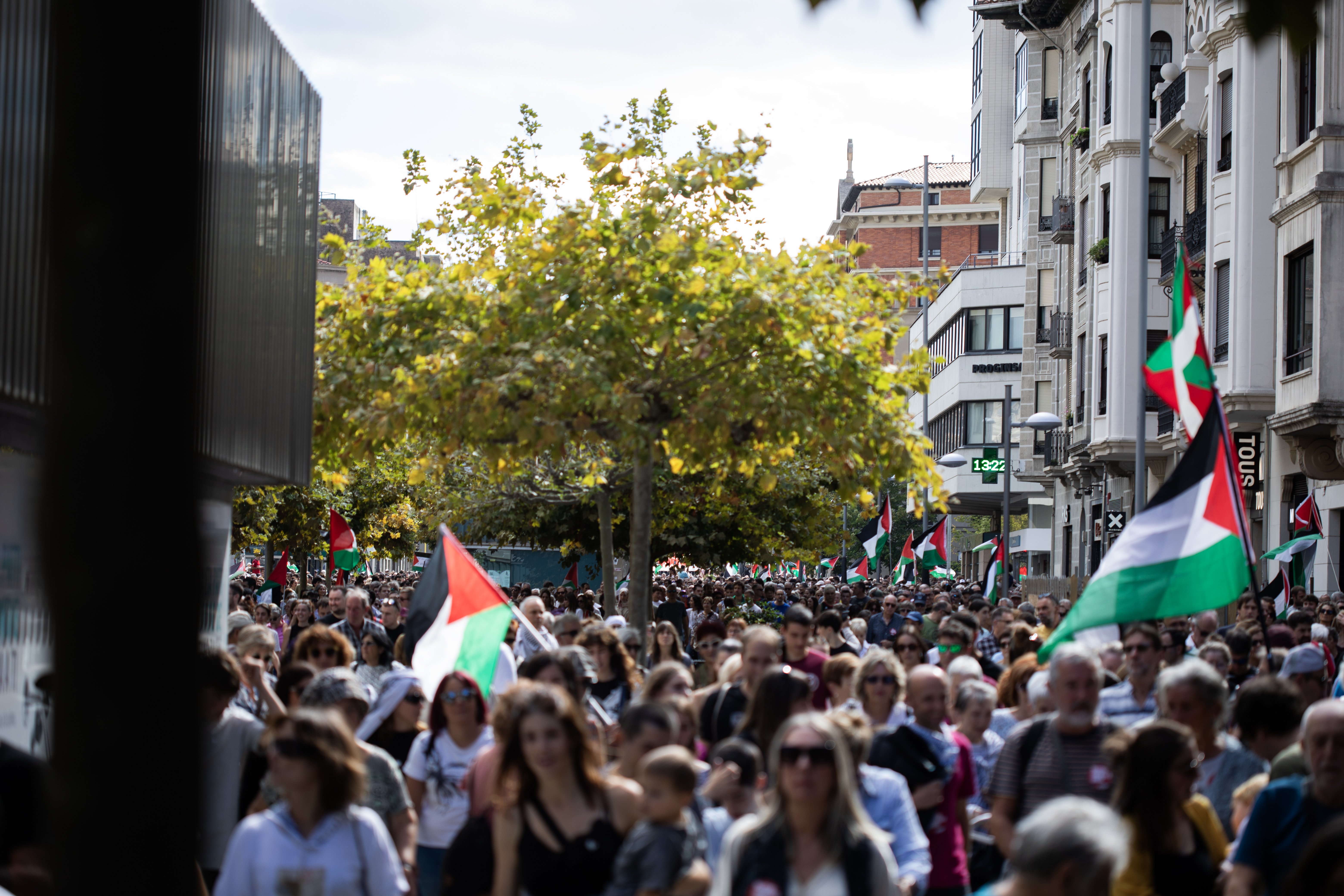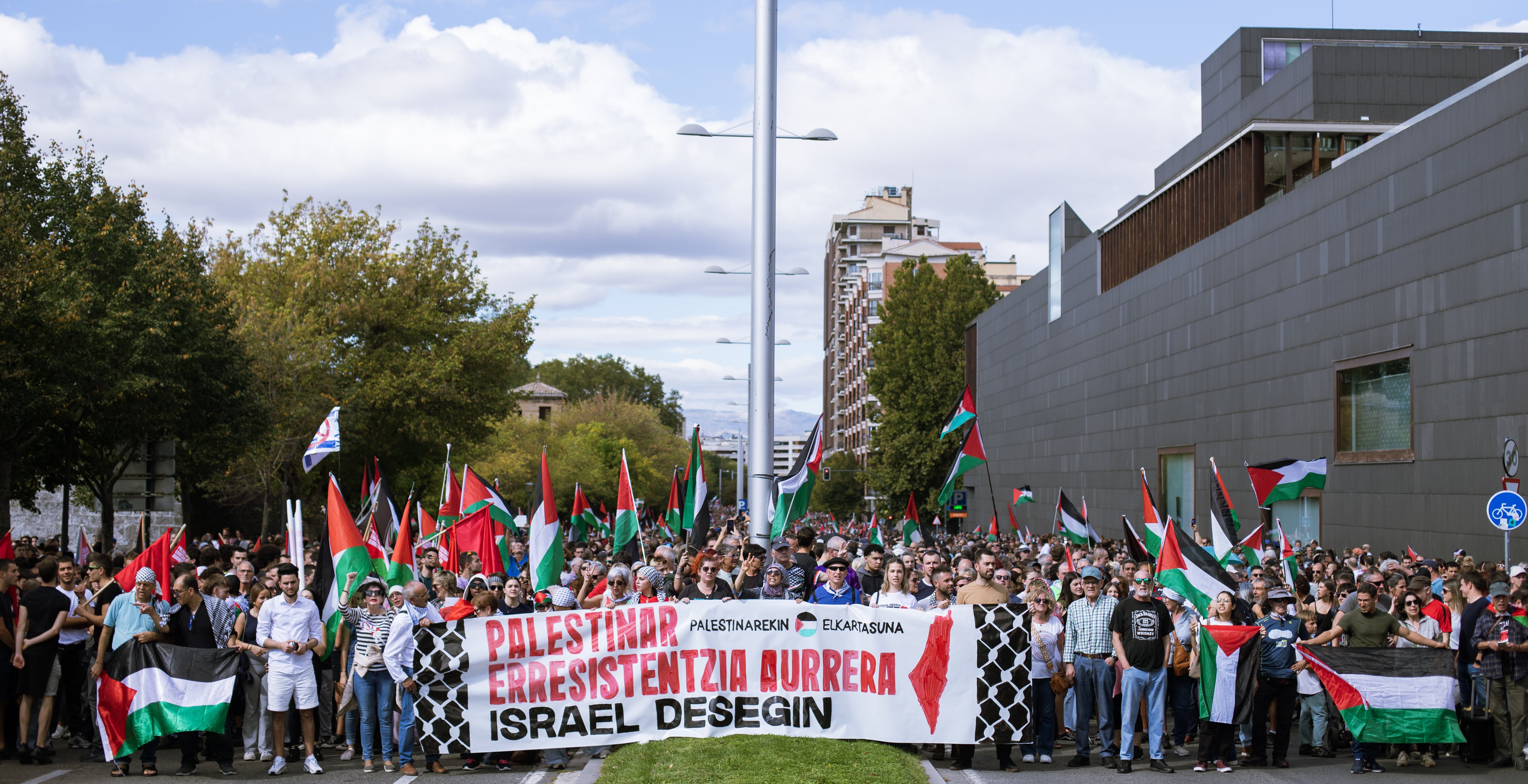 Beste behin ere, Euskal Herrian kaleak bete dituzte, Israelgo Estatu sionistaren suntsipena exijitzeko. Palestinarekin Elkartasuna plataformak antolatuta, mobilizazio erraldoi bat izan da eguerdian Iruñean (Nafarroa), 12:00etan Antoniuttitik abiatuta. 50.000 pertsona mobilizatu dira, hainbat hedabideren arabera.
