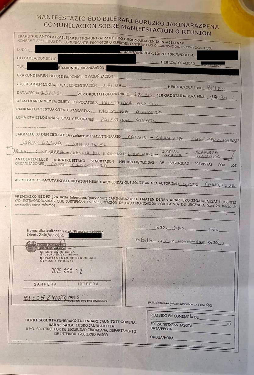 Antolatzaileek duela hilabete egin zuten lehenengo jakinarazpena. Hasieran agintaritzek atzera bota zuten palestinar erresistentziaren aldeko kalejira egiteko eskaera, planteatzen zen ibilbidea (Areatza-On Diego Lopez Haroko Kale Nagusia-Jesusen Bihotza) aitzakiatzat hartuta; izan ere, argudiatu zuten arratsalde berean beste zenbait deialdi eginak zeudela. Gerora, ordea, jakinarazpena berriz tramitatzean, ez da inolako arazorik egon.