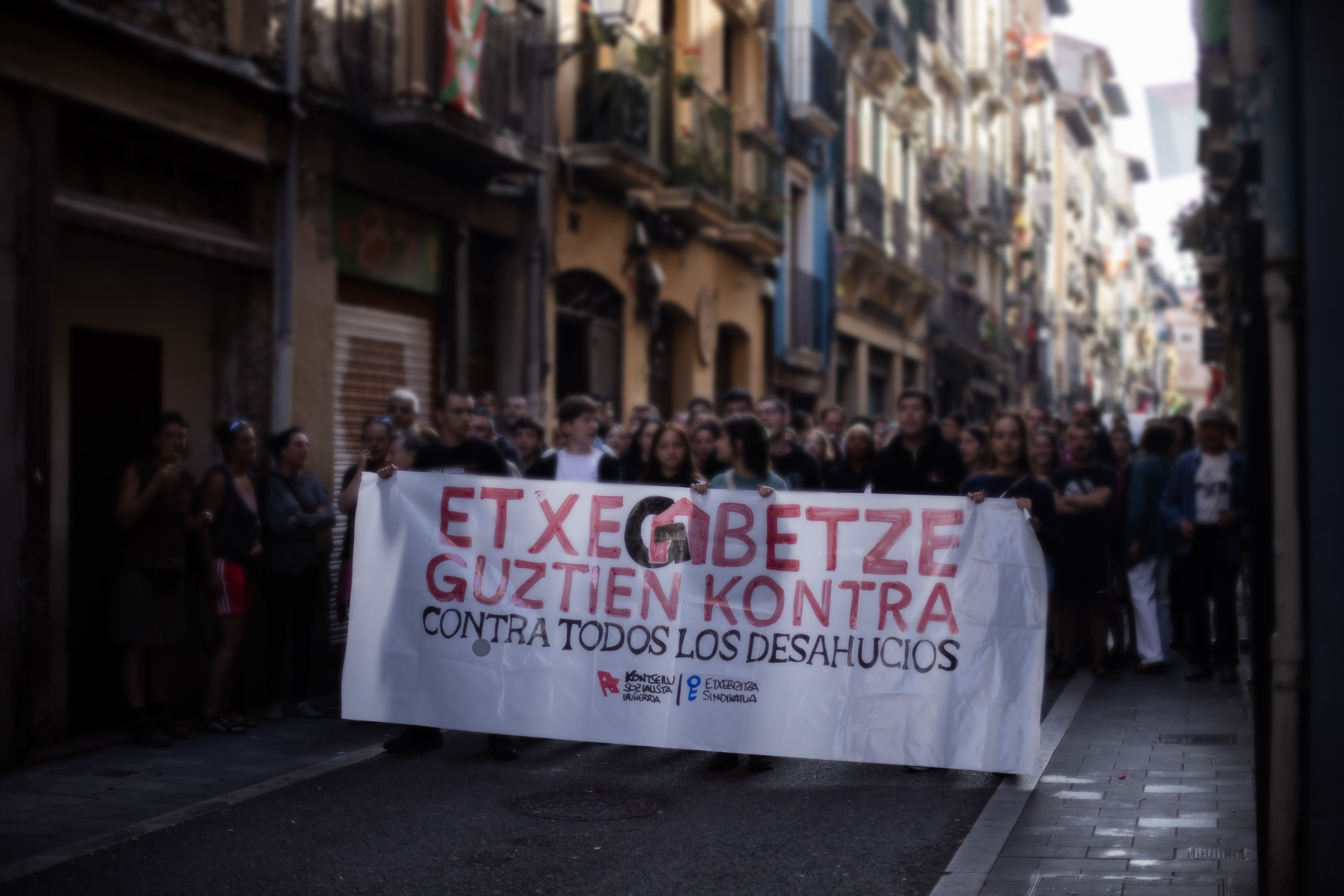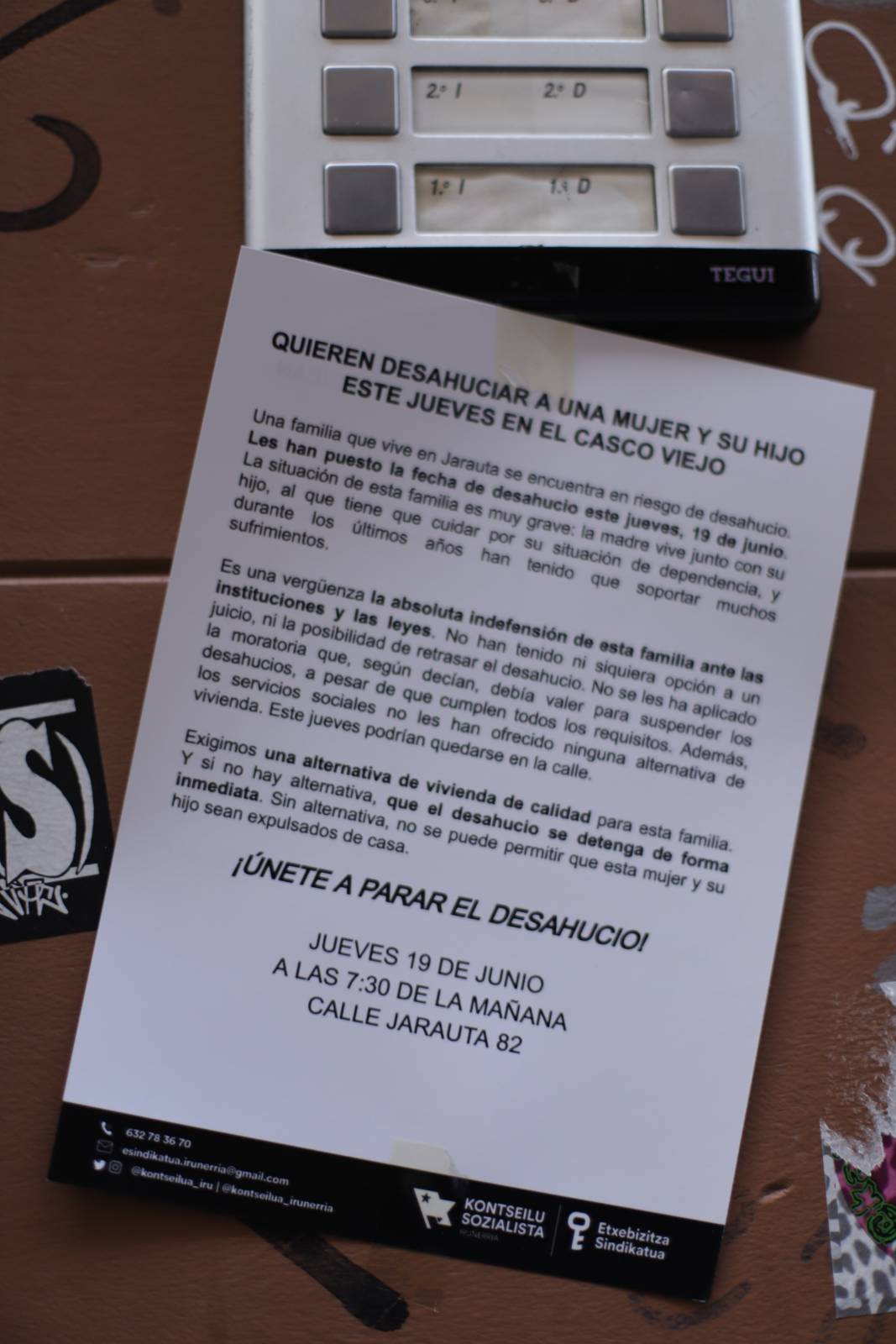 Sadaha izeneko andre bat eta bere semea gaur goizean bota behar zituzten euren etxetik Iruñeko (Nafarroa) Alde Zaharrean. Berez, epaitegitik ordu konkretu bat zeukaten finkatuta etxegabetzerako: 09:00etan gauzatu nahi zuten desalojoa. Kaleratzeari aurre egitera deitu zuen Iruñerriko Etxebizitza Sindikatuak, ordea, eta 07:30erako jende ugari elkarretaratu da Jarauta kalean, etxegabetzeari aurre egiteko prest.