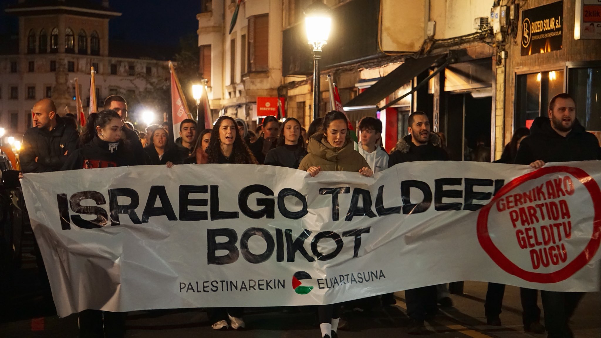 Aurreko ostegunean jakinarazi zuten Elitzur Ramla saskibaloi-talde israeldarrak, azkenean, ez duela Gernikan (Bizkaia) jokatuko: partidu horiek Bulgariara lekualdatzea erabaki dute. Palestinarekin Elkartasuna plataformak nabarmendu duenez, "aste hauetan zehar Gernikan martxan jarri dugun borrokaren ondorioa" da erabaki hori. Dena den, partidak bertan behera uztea lortu duten arren, larunbaterako egina zuten mobilizazio-deialdia mantendu zuten antolatzaileek, lortutakoa aldarrikatzeko eta "Israelen aurkako boikota ez dela amaitu argi uzteko". Larunbat arratsaldean, hala, 18:00etan abiatu zen manifestazio bat Merkuriotik, Israelgo taldeei boikot lelopean.