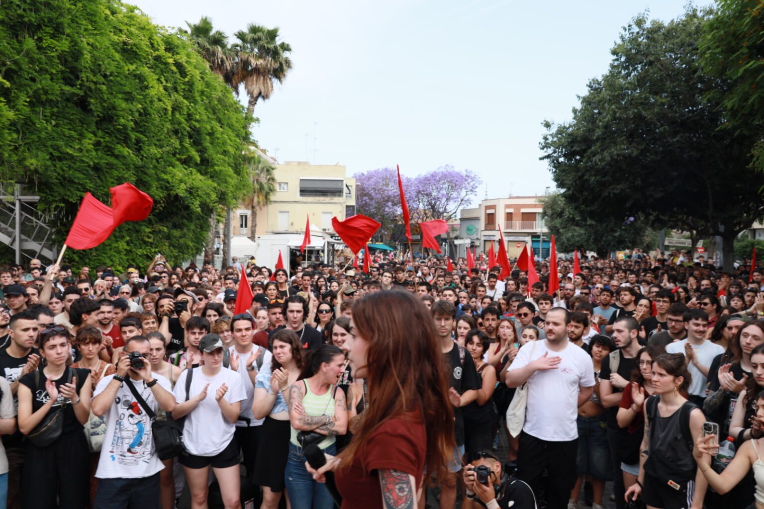 Hitzaldian, azken bi asteetan gertatutako heriotzak gogoratuz hasi zen OJSko bozeramailea: Gazako familia baten aurkako sarraskitik Kanarietara migratzen ari zirela itotako zazpi emakumeetaraino; eta aipamena eginez Sentmenaten emakume batek jasandako erasoari eta senarrak semeordea hil izanari, edo etxerik gabeko bi pertsonak Bartzelonan jasandako erasoari, besteak beste. "Itxuraz elkarri lotuta ez dauden gertakari horiek ordena sozial kapitalistan dute oinarria, esplotaziora, miseriara, lehiara eta zapalkuntzara kondenatzen gaituena", zioen.