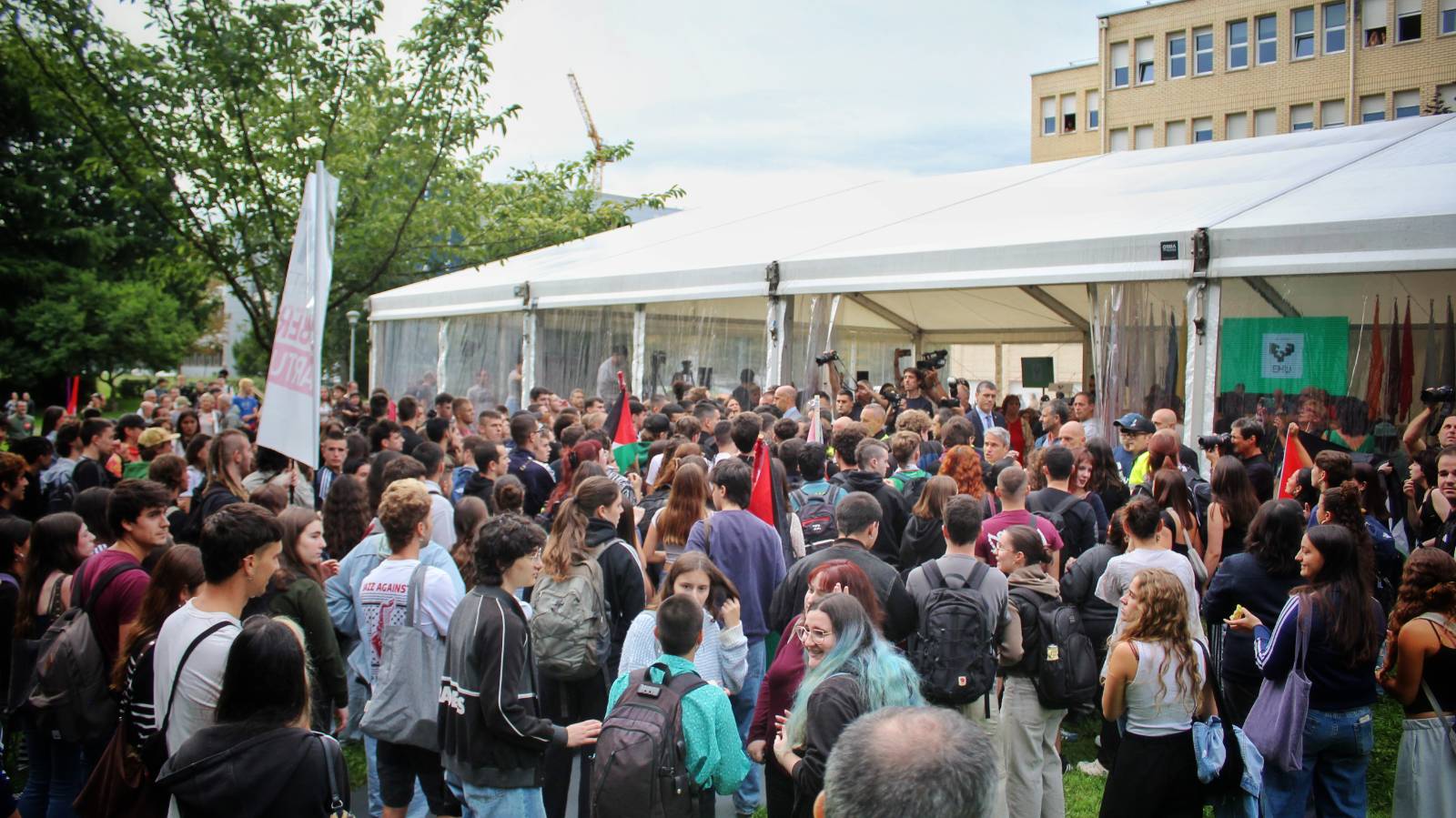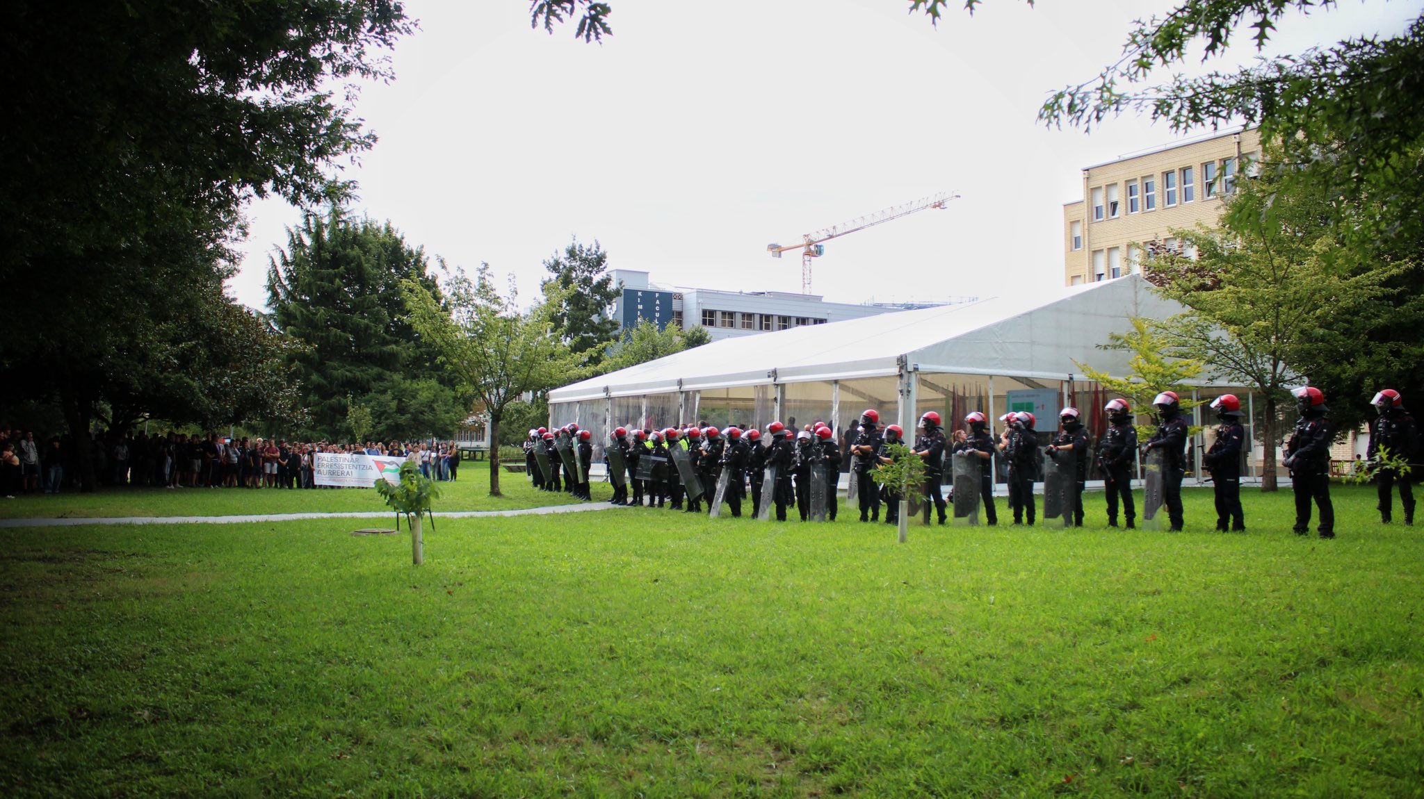 Errepresio-indarren presentzia handia izan da mobilizazioaren aurka, eta tentsio-uneak sortu dira, ikasleak Palestinaren aldeko aldarriak ekitaldira sartzen saiatu baitira, irmotasunez. Segurtasun-indarrek osatu dute haien aurkako lerro bat lehenengo, eta Ertzaintza bertaratu da gero, gazteen protesta ekitalditik urruntzeko asmoz. Dena den, ikasleen oihuak eta EHUko eta Jaurlaritzako ordezkariei egindako txistuak ozen nagusitu dira campusean.