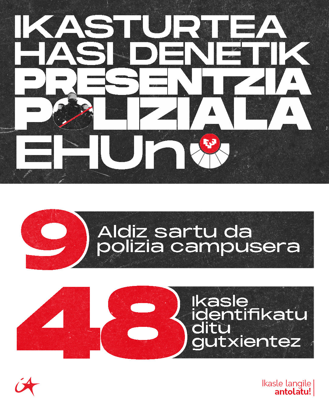 Bi hilabete ere ez dira igaro ikasturtea hasi zenetik, baina denbora horretan polizia-indarrek Euskal Herriko Unibertsitatean (EHU) izandako esku-hartzeari buruzko hainbat datu eman ditu jada Ikasle Abertzaleakek (IA), ikaragarriak baitira. Irailaren hasieratik hona, Polizia bederatzi aldiz sartu da EHUko campusetara; esaterako, Leioako campusera sartu eta Palestinaren alde greba egiten ari ziren ikasleei jazarri zien Ertzaintzak urriaren 15an. Gainera, 48 ikasle identifikatu dituzte poliziek aldi horietan, eta oraindik ez dago garbi zein ondorio izango dituen horrek.