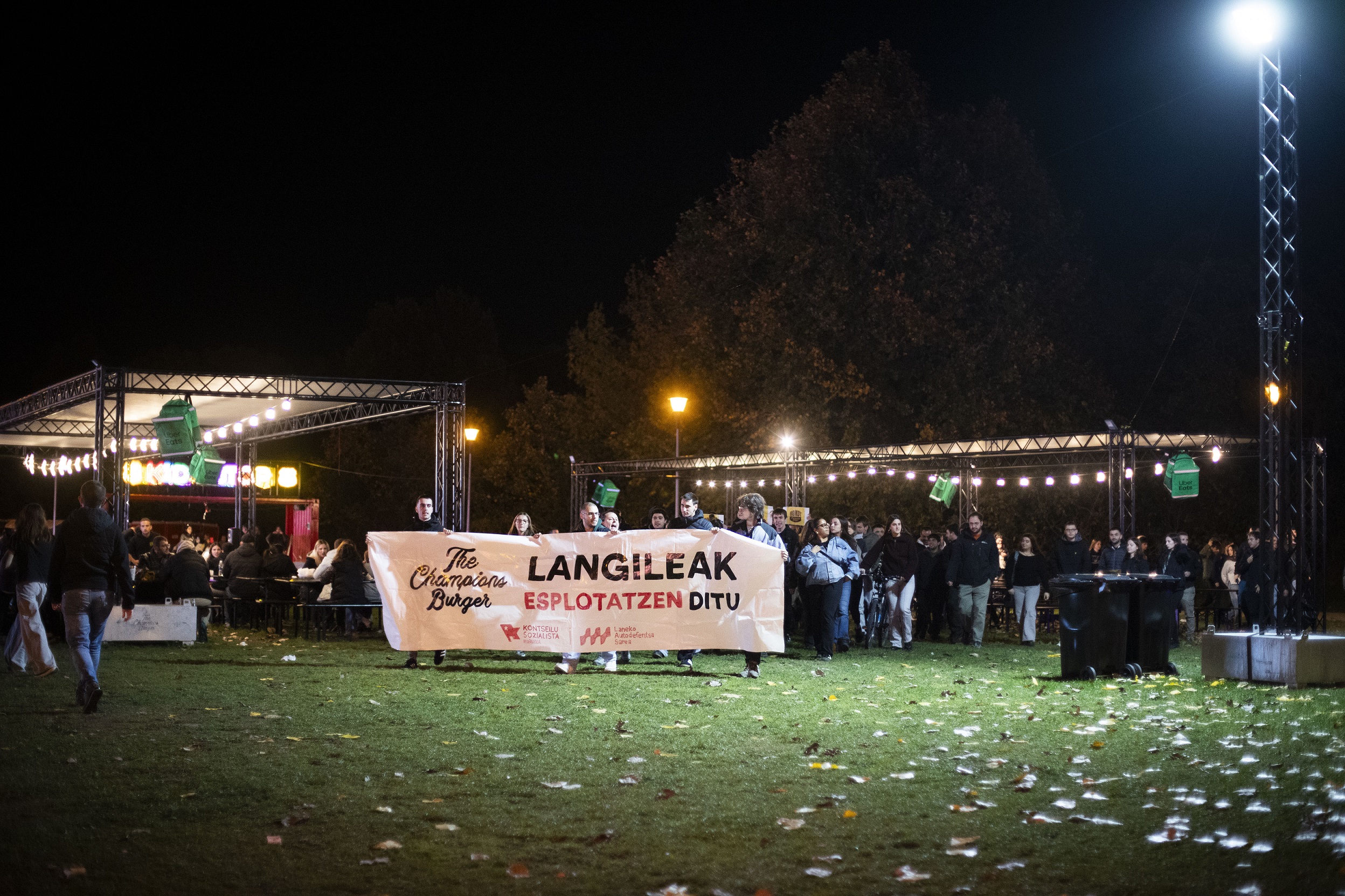 Iruñerriko Laneko Autodefentsa Sareak (LAS) ere salatu ditu azken egunetan makroekitaldiko lan-baldintzak: "Iruzurrezko kontratazioa, egun batetik besterako deiak, osorik ordaintzen ez diren lanaldiak, baldintzen funtsezko aldaketak abisurik eta kontsultarik gabe...". LASek, hain zuzen ere, protesta zaratatsu bat egin zuen aurreko astean jaialdi barruan, The Champions Burger: langileak esplotatzen ditu zioen pankarta batekin. Ekimeneko lan-baldintzak salatzeko eskuorriak bota zituzten manifestariek espazio osoan zehar.